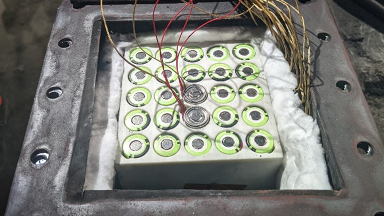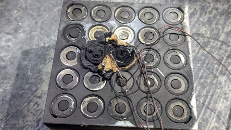 SABIC與美國保險(xiǎn)商實(shí)驗(yàn)室(UL)合作測試熱失控阻隔方案,以驗(yàn)證其性能。測試包括將25個(gè)標(biāo)準(zhǔn)18650柱狀電芯放在一個(gè)盒子里,用2毫米厚的FR STAMAX 30YH570樹脂阻隔層將它們隔開,然后觸發(fā)中間的兩個(gè)電芯,引發(fā)熱失控。