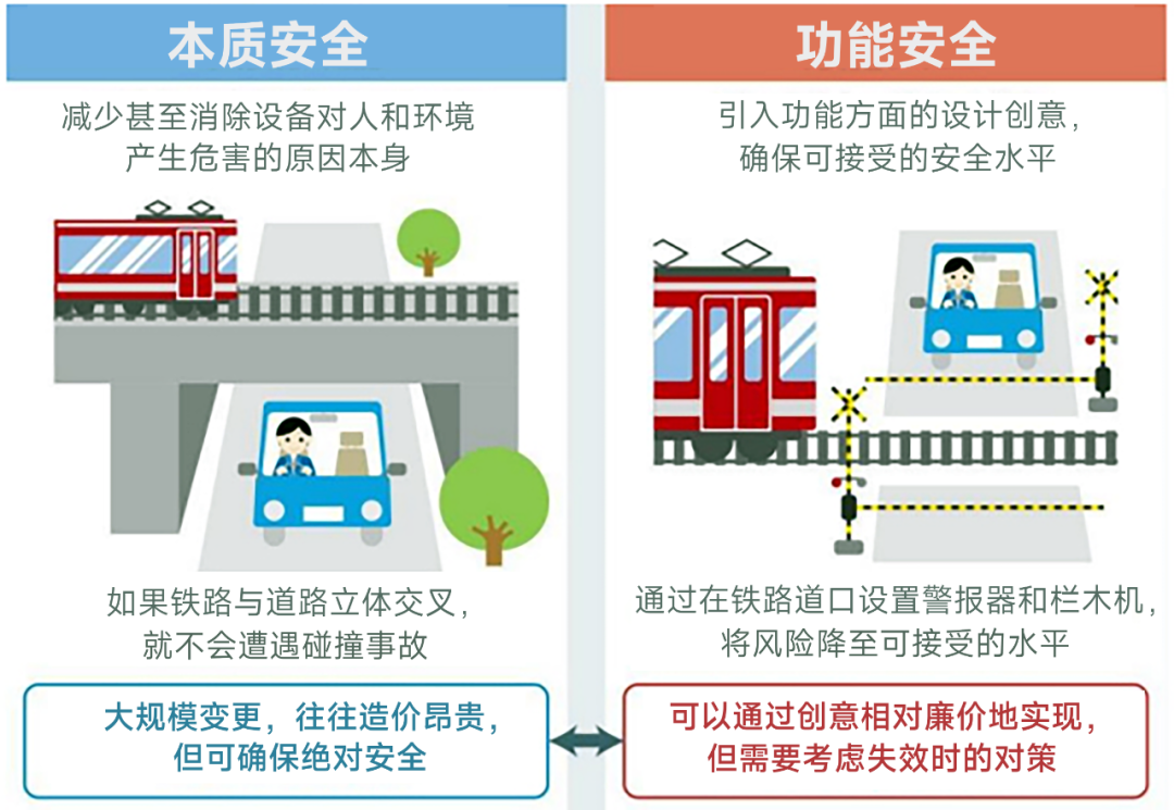 舉個(gè)例子,在鐵路和道路交叉口,如果采用建立交橋的方法將鐵路和道路分開,從物理上避免火車和汽車碰撞的方法,這是一種本質(zhì)安全的思路。而如果通過在道路與鐵路的交叉處設(shè)置警報(bào)器和欄桿,在鐵路上安裝傳感器,當(dāng)傳感器檢測到火車接近時(shí),警報(bào)器響起,并降下欄桿,當(dāng)另外的傳感器檢測到火車已經(jīng)通過時(shí),警報(bào)器停止,并升起欄桿,雖然道路與鐵路在物理上仍然交叉,但可通過設(shè)置鐵路道口的方法將汽車和火車相撞的風(fēng)險(xiǎn)降低到可接受的水平,這就是功能安全的思路。當(dāng)然,在這個(gè)案例中,如果傳感器損壞,那么在火車接近時(shí),警報(bào)器和欄桿就不會(huì)工作,這是一種“危險(xiǎn)”狀態(tài),因此就需要加入傳感器的自我診斷或者雙傳感器的冗余設(shè)計(jì),來確保即使傳感器損壞也不會(huì)引發(fā)危險(xiǎn)狀態(tài)的設(shè)計(jì),這就是故障安全(Fail Safe)的思路。